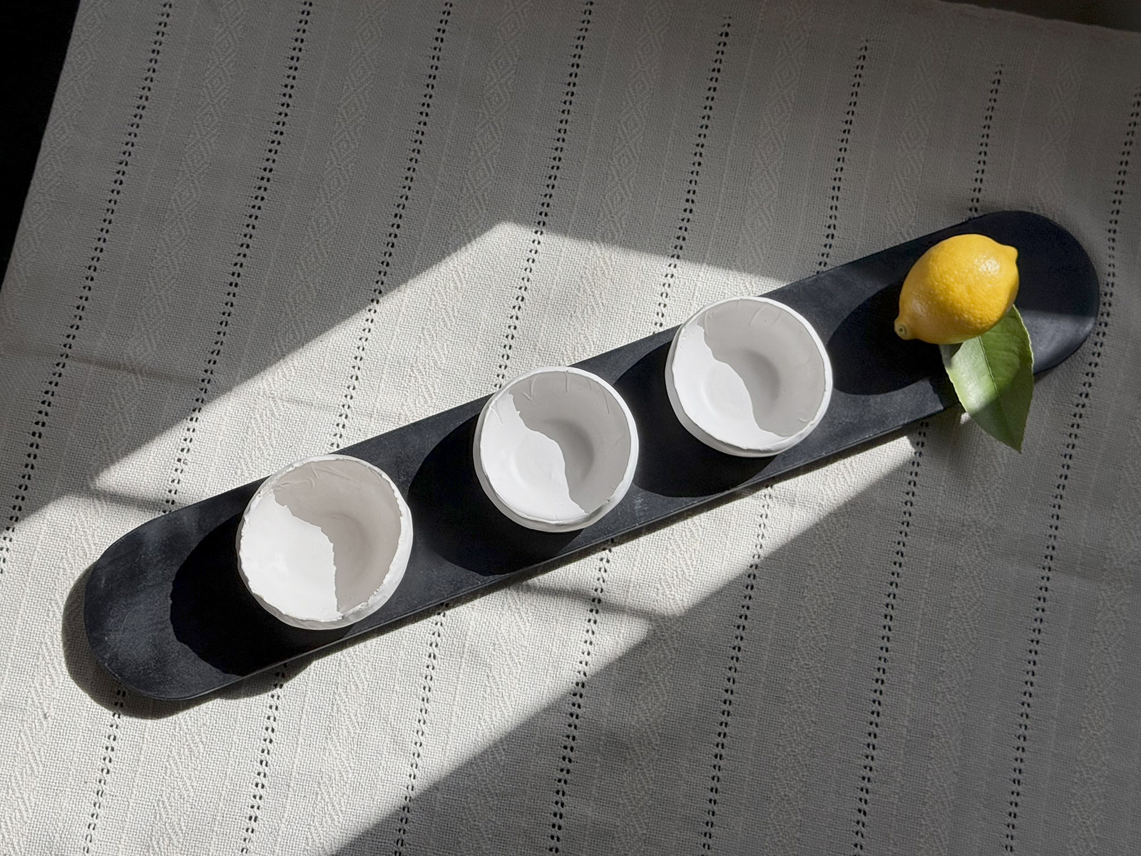 Natural black marble with swirling veins give this board its distinct character. The oval cheese board is ideal for sophisticated displays of appetizers and cheeses or petit-fours and fruit.