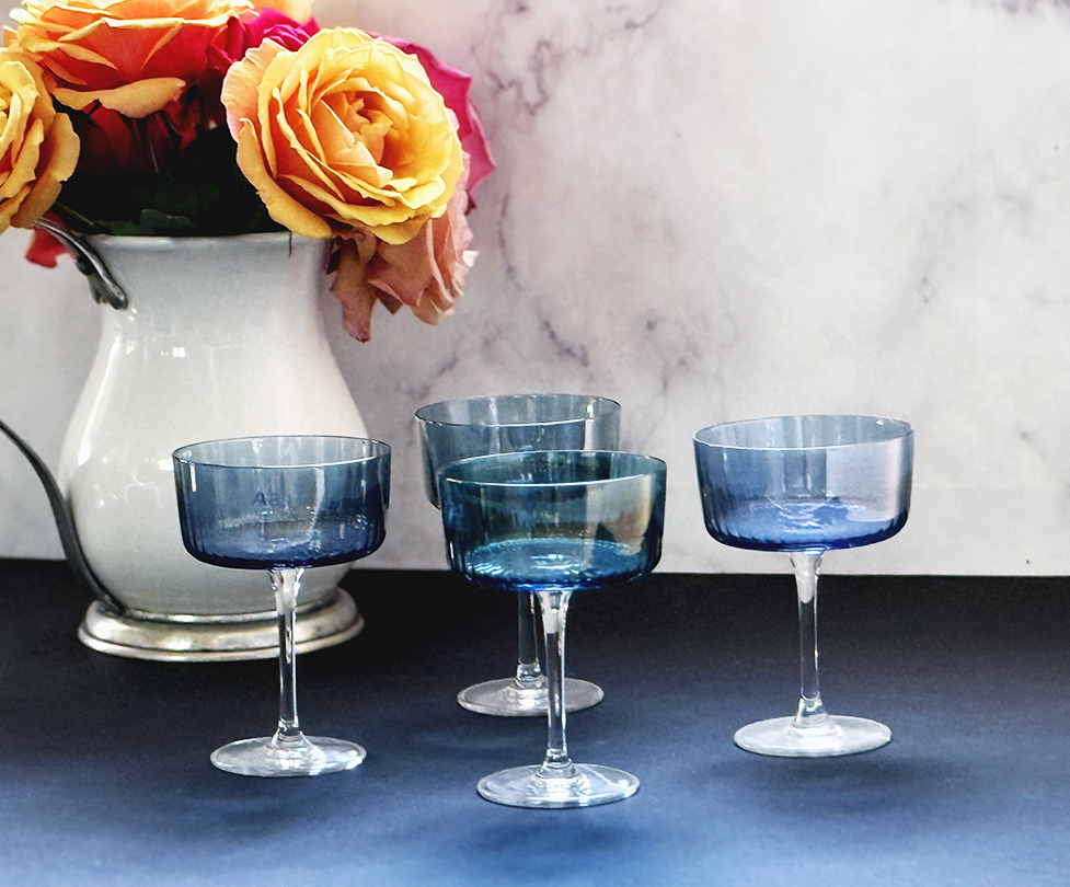 Elegant handblown champagne glasses with subtle pleated texture that catch the light. Iridescent colours evoke the facets of polished gemstones.