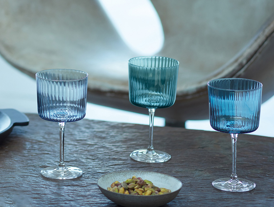 Textured wine glasses. Hand painted in assorted tonal sheer lustres and then fired at a high temperature.