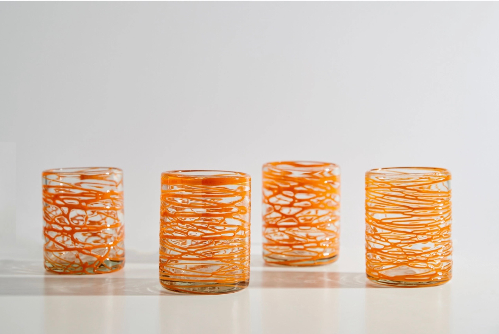 Beautiful orange swirls made from a portion of recycled glass gives each tumbler in this handmade set a unique pattern of its own. Perfect for iced coffees, spritzes and cocktail nights.
