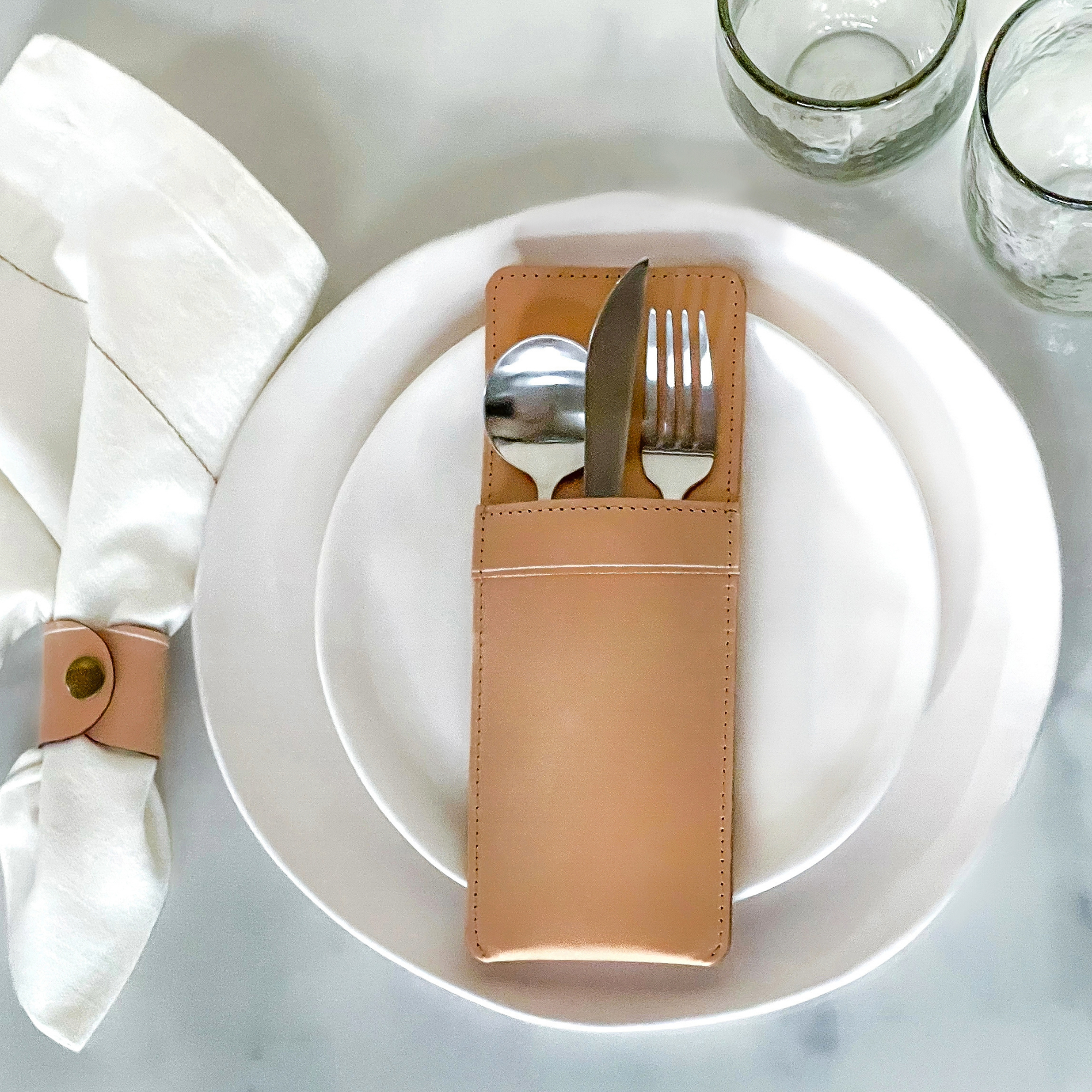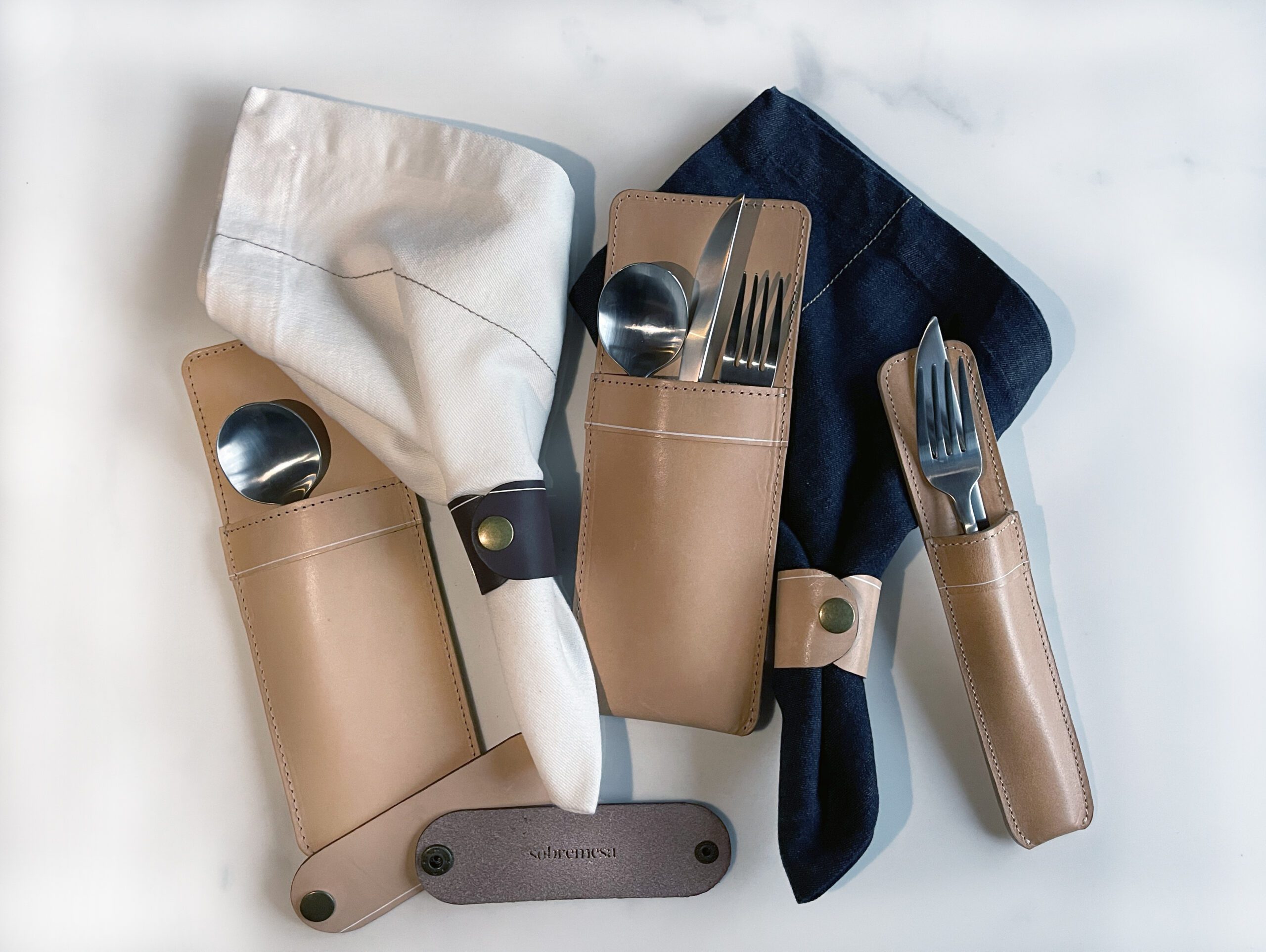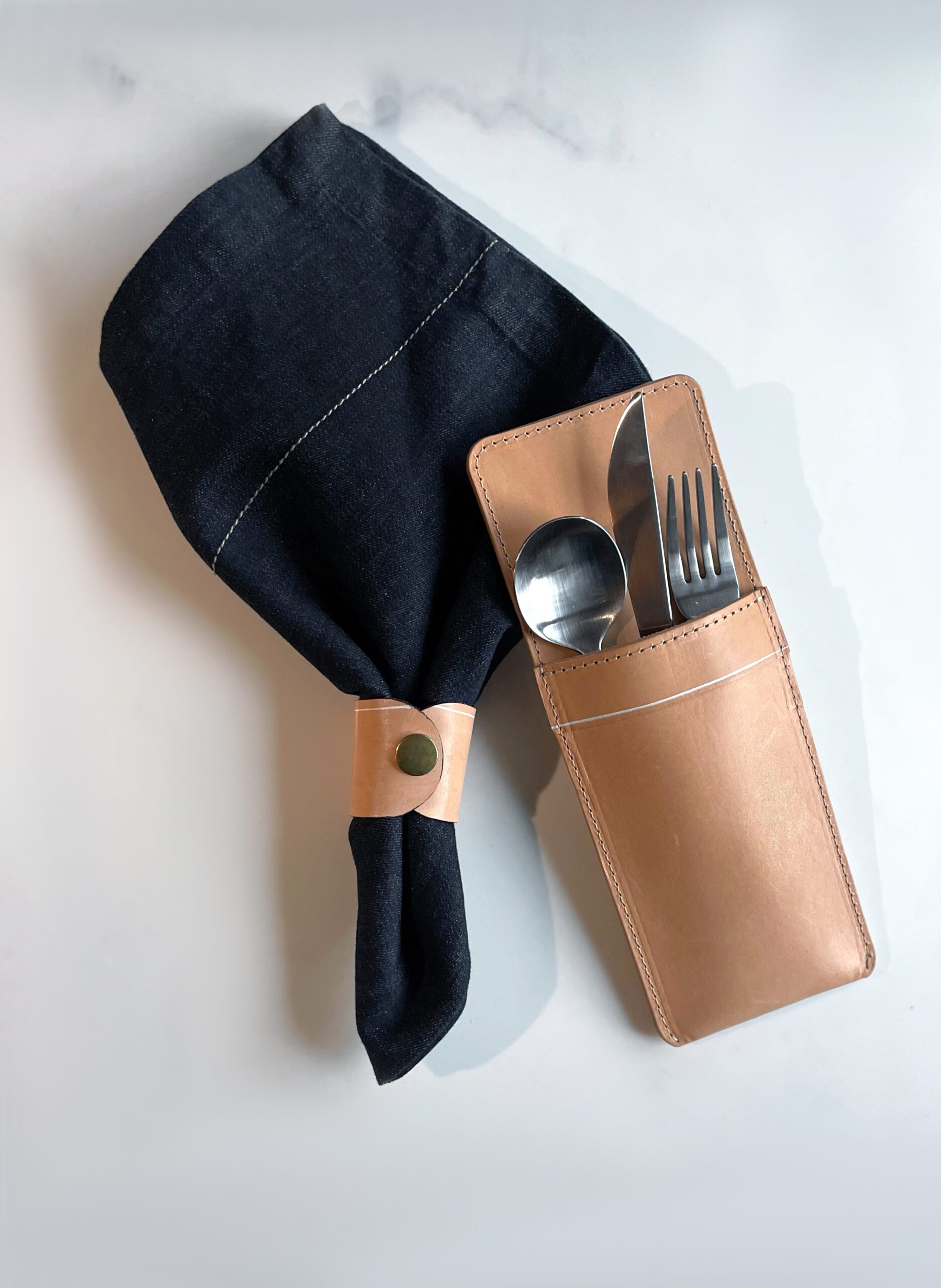 This natural leather utensil holder is proudly handcrafted by local artisans in Los Angeles and perfect for holding three items of cutlery.