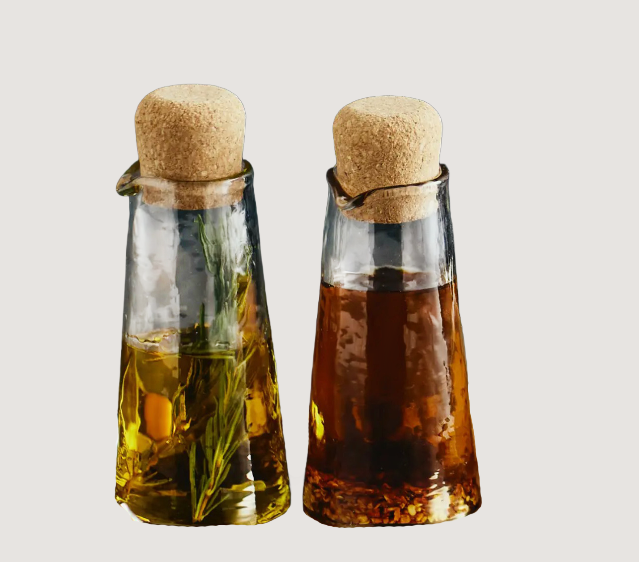 Keep olive oil fresh and flavorful with these oil-cruets. Crafted from naturally textured glass with a cork top that protects olive oil from oxidation.