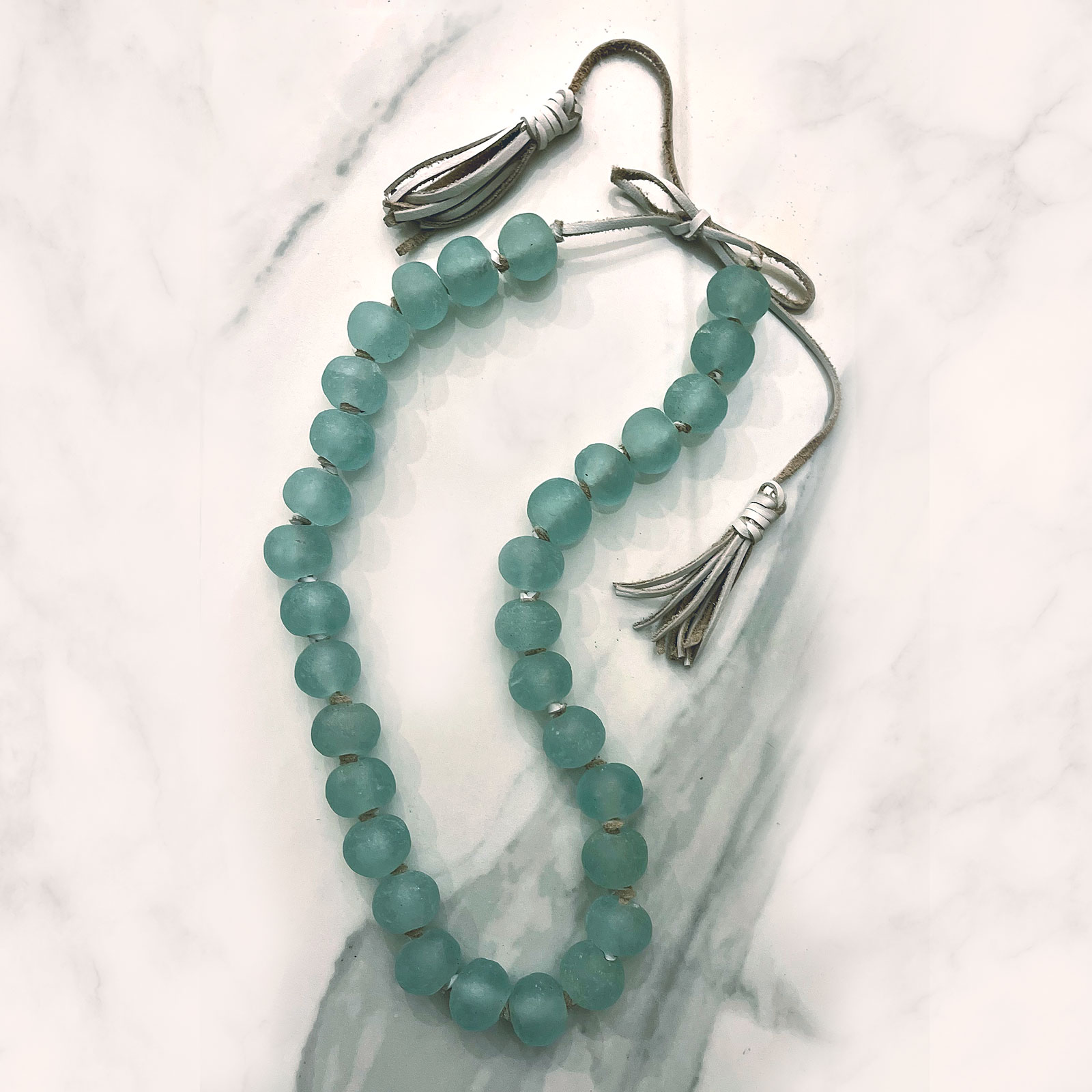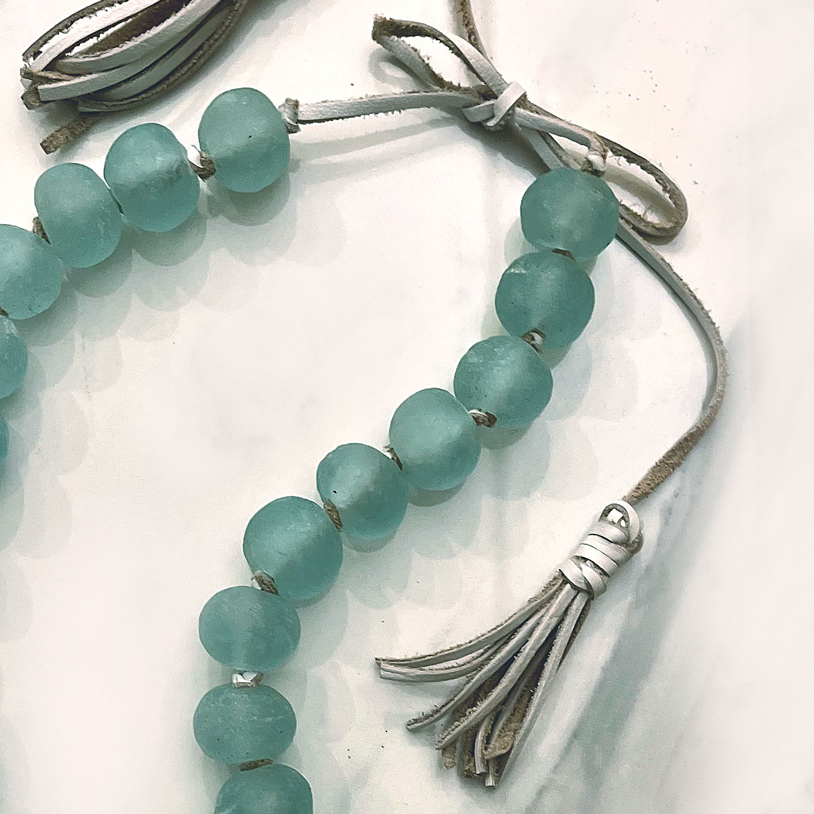This particular styling design features handmade beads the color of turquoise, held together by a cord of hand-strung, hand-knotted white leather capped off with tassels.