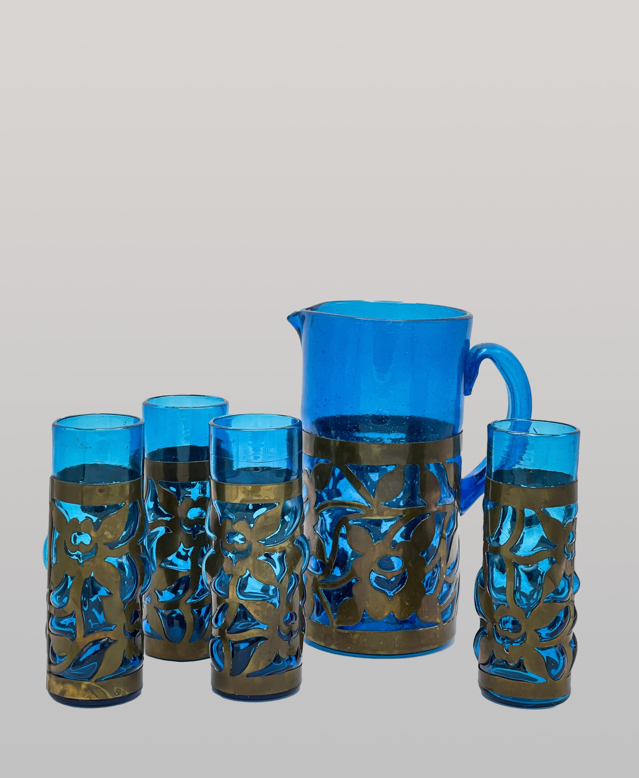 Handblown blue glassware caged in a decorative metal sleeve, this vintage drinkware set comes with four highball glasses and a pitcher and is a great statement piece for any tabletop.